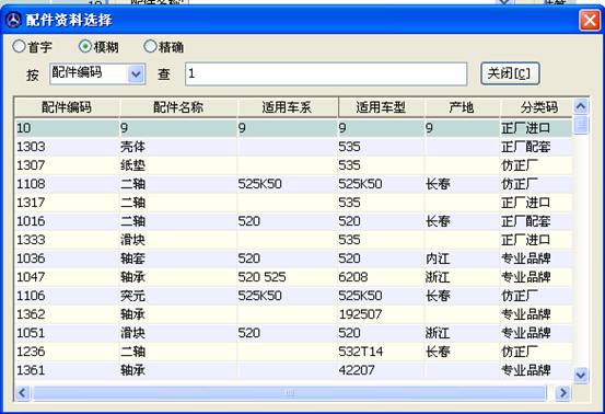 ,可以按配件編碼、配件名稱、適用車名、適用車型、產地、分類碼等等來查詢,選擇一個您熟練的,新來的貨物里這些資料總會有其一的,有就能找到它歸屬地。直接輸入后不需要再按什么鍵,如果有就會直接顯示出來,沒有就不會顯示出來,例如: