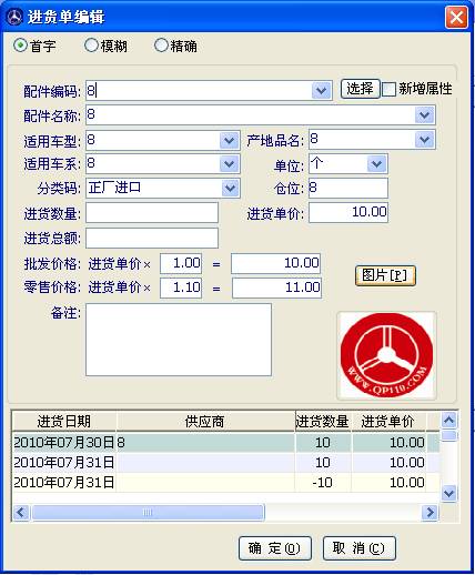 同樣查詢進貨歷史的方法在進貨入庫時查詢,任意輸入好供應商等等,開一張新單,輸入您要查詢的配件名稱或者配件編碼號,