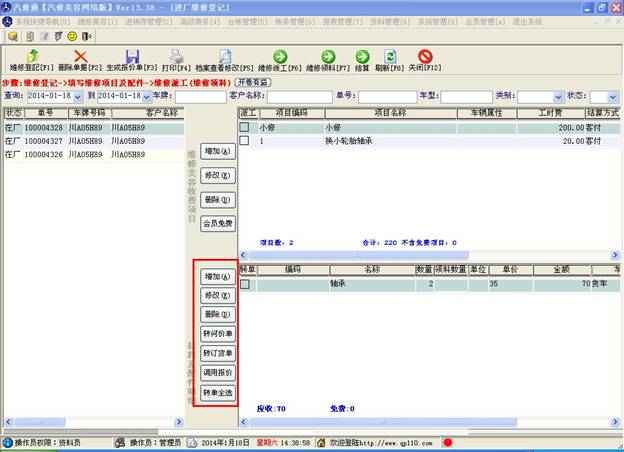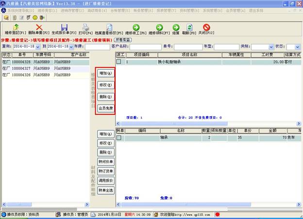 注意,此窗口主要是做進(jìn)廠車輛的登記,登記客戶資料及維修項(xiàng)目和所需配件,在此做了維修項(xiàng)目和所需配件的登記才能做后面的派工及領(lǐng)料操作