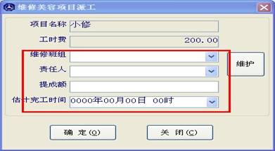 維修派工是指將維修登記里錄入的維修項(xiàng)目指派給某位員工進(jìn)行修理,并設(shè)置此維修項(xiàng)目修完后給員工的提成。如下圖,輸入維修班組,責(zé)任人,提成額等信息,點(diǎn)確定即可,注意,每個(gè)項(xiàng)目都有派工