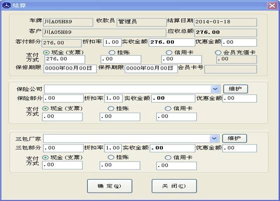 填寫配件資料后點(diǎn)確定,完成某一個(gè)配件的錄入,當(dāng)您一個(gè)單子有多個(gè)配件時(shí),您可以繼續(xù)添加配件。錄完配件后,點(diǎn)取消就進(jìn)入了結(jié)算窗口。如下圖