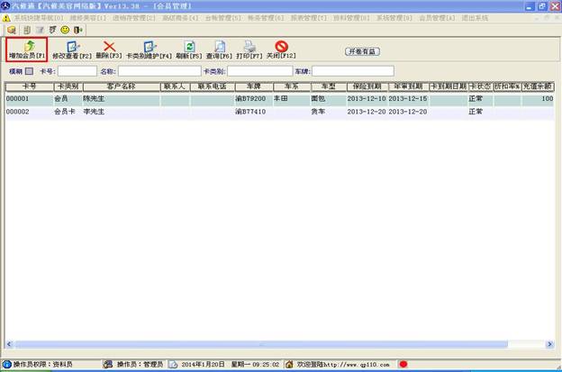 會(huì)員管理里可以添加會(huì)員卡,會(huì)員保險(xiǎn)提醒等功能,打開會(huì)員管理如下圖,點(diǎn)擊“增加會(huì)員”按鈕。