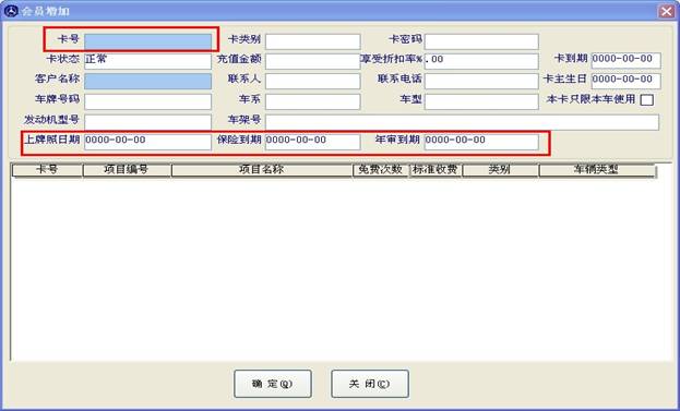 下圖為會(huì)員增加窗口,如果您有讀卡器,在刷卡時(shí)卡號(hào)會(huì)自動(dòng)讀入到“卡號(hào)”框了,輸入客戶信息,保險(xiǎn)到期,年審到期等信息點(diǎn)確定。