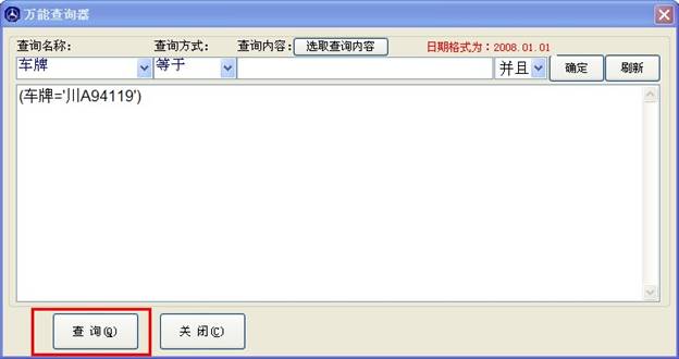 點(diǎn)擊確定后如下圖,在中間的大文本框內(nèi)會(huì)現(xiàn)樣(車牌='川A94119') 的字樣,您點(diǎn)確定,就能查找出車牌號(hào)為 川A94119 的車子的維修記錄