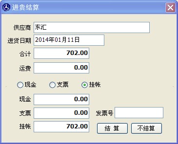 如果這個(gè)單子沒有運(yùn)費(fèi),可不用填寫,選擇結(jié)算方式,當(dāng)結(jié)算方式為掛帳時(shí),在應(yīng)付款里就會(huì)有這筆款項(xiàng)。