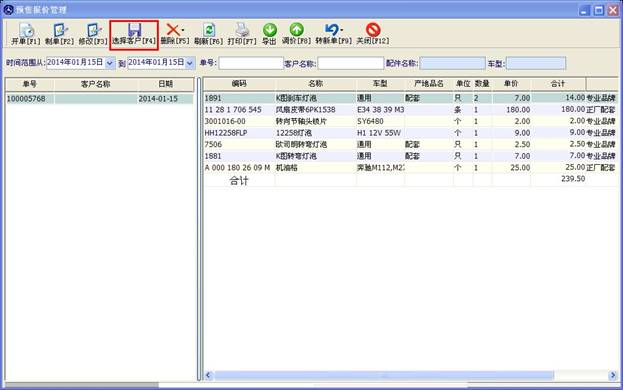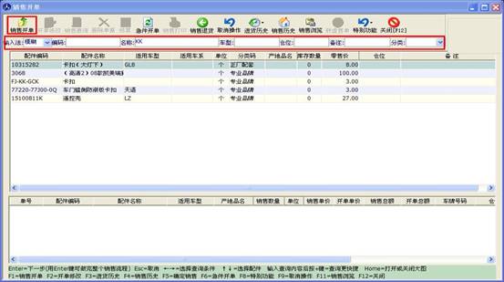 窗口分為上下兩部分,上部分顯示的是開出的單子及客戶一些信息,下部分對(duì)應(yīng)的是此單子里包含的配件信息。