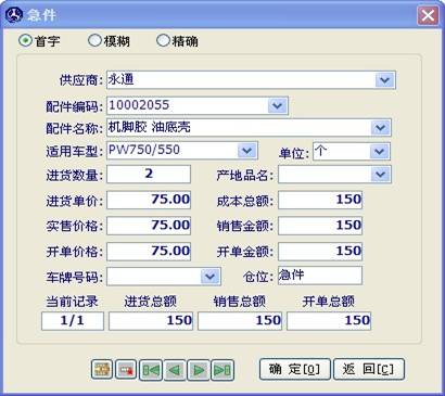 在左側(cè)輸入供應(yīng)商后,點(diǎn)擊“進(jìn)貨”按鈕,打開配件資料錄入窗口如下圖