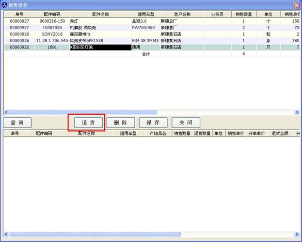 點(diǎn)擊確定后,之前的銷售退貨窗口的下邊表格里就會(huì)出現(xiàn)您要退貨的配件,如下圖。如果您還有要退的配件,可以繼續(xù)以上的操作,如果沒有,請(qǐng)點(diǎn)擊“保存”按鈕進(jìn)入結(jié)算流程