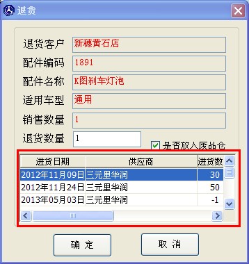 如圖2.3.1,選擇要退貨的配件后,點(diǎn)擊“退貨給供應(yīng)商”按鈕,進(jìn)入退貨窗口,如下圖 2.3.2.1 選擇正確的退貨批次,輸入退貨數(shù)量后,點(diǎn)結(jié)算完成退貨功能。
