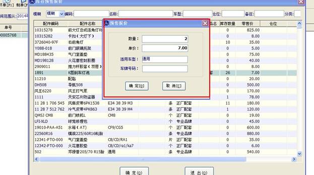 雙擊您需要的配件,在彈出的窗口內(nèi)輸入數(shù)量和單價(jià)點(diǎn)確定,這樣就有一個(gè)配件進(jìn)入了您的報(bào)價(jià)表內(nèi),如果還有更多的配件需要報(bào)價(jià),您可以在這里繼續(xù)選擇。當(dāng)需要的配件都選擇好后,點(diǎn)擊大窗口的“退出”按鈕