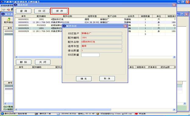 歸還操作和銷售退貨操作差不多,先是使用查詢功能找到您要操作的配件,雙擊后出現(xiàn)歸還窗口,如下圖,輸入數(shù)量后點(diǎn)確定,如果有多個(gè)配件歸還還可繼續(xù)操作,之后點(diǎn)保存按鈕完成借出歸還操作。