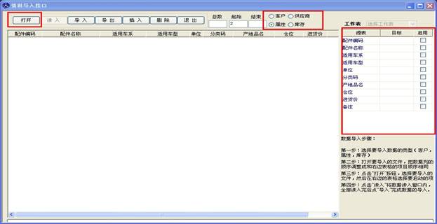 數(shù)據(jù)導(dǎo)入導(dǎo)出可以將您保存在電腦上的excel 文件 導(dǎo)入到軟件里,此窗口支持導(dǎo)入的有客戶資料導(dǎo)入,供應(yīng)商導(dǎo)入,屬性導(dǎo)入和庫存導(dǎo)入,如下圖。四個(gè)類型的導(dǎo)入操作都一樣,現(xiàn)在我們以屬性導(dǎo)入為例進(jìn)行講解。
